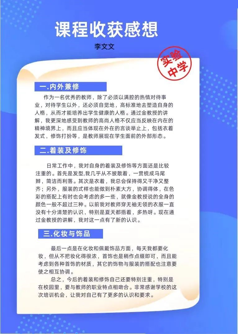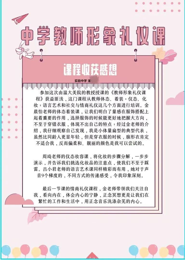 4天培训课让学员们收货满满。作为一名教师,不仅要拥有丰富的学识和美好的思想,也要具有与内在美相匹配的良好教师形象。美能愉悦身心、美能传递价值、美能改变生活。美从改变自己开始,做表里如一的最美教师!