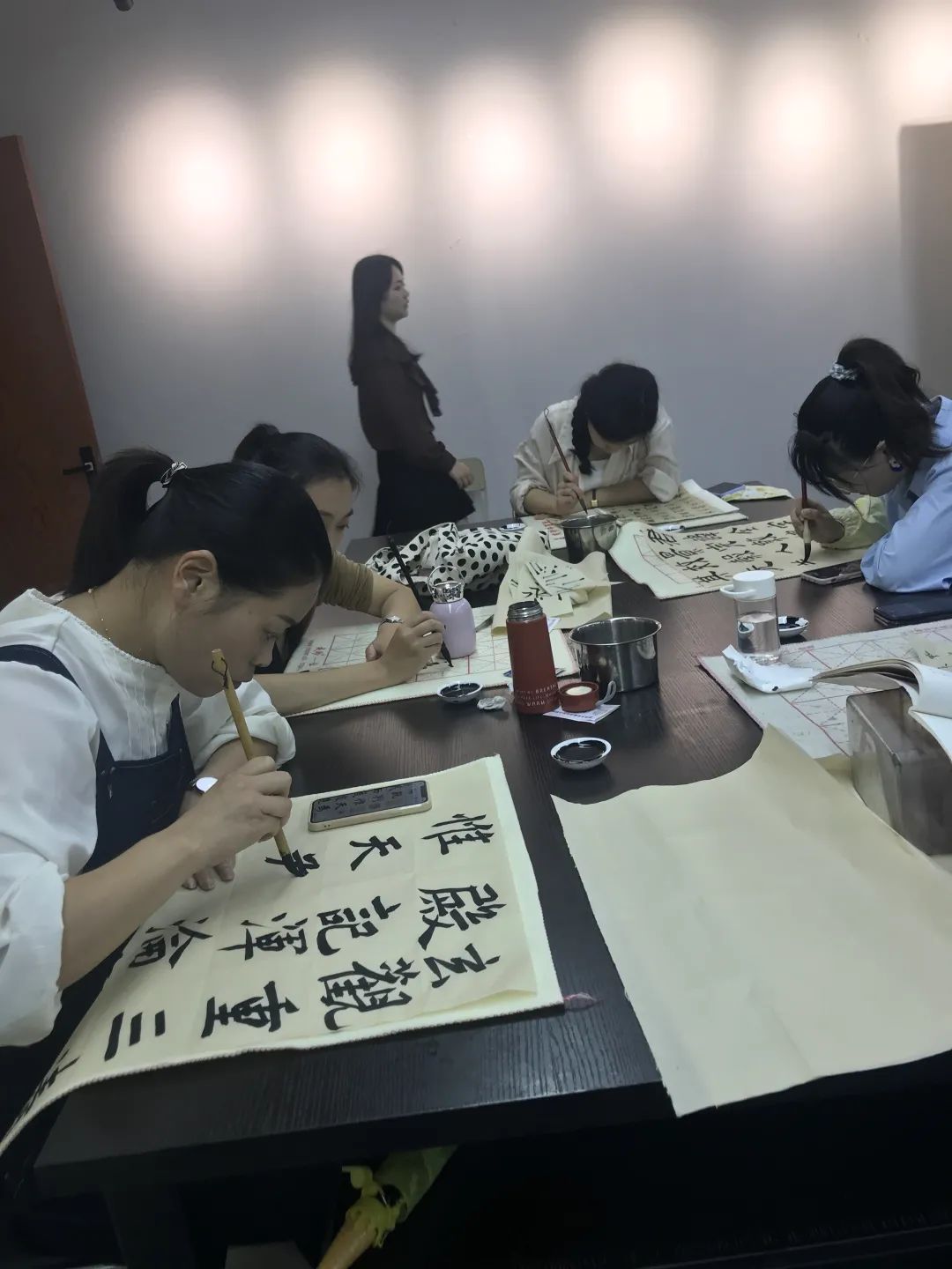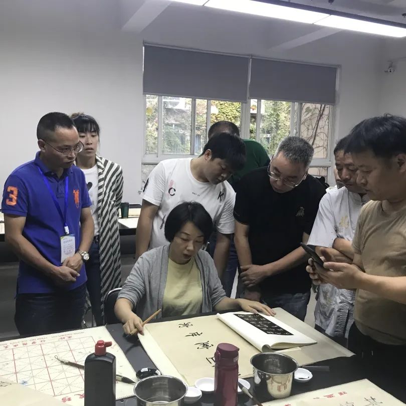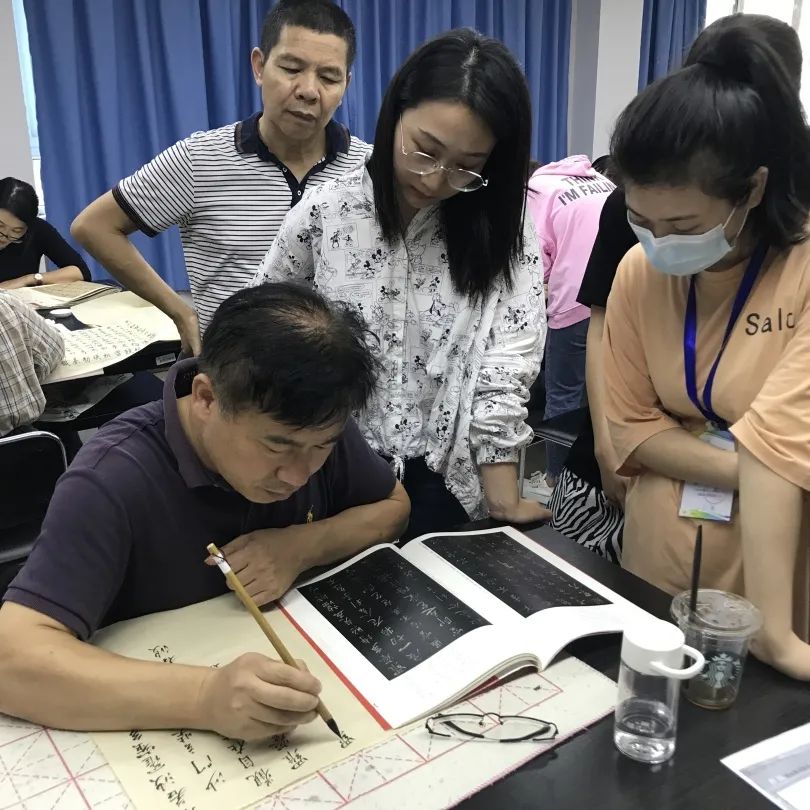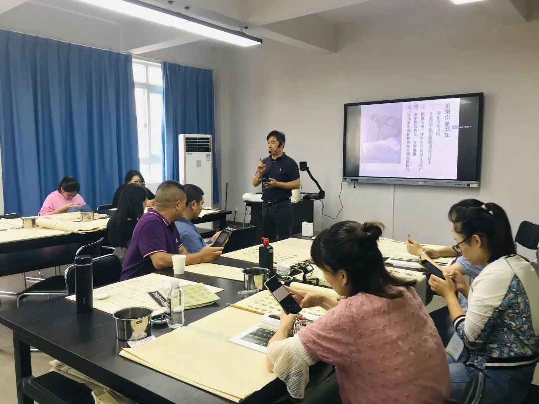 本课程主要从中小学教师书法教学素养需求出发,精心安排教学内容,着力强化技法练习“三部曲”(平衡控制能力+读帖导入+习作转化),带领学员进行楷、行书分解练习及隶书大字专题训练,以转变书法学习观念、技法疏导与能力提升为主旨,并就中小学书法教育课堂经验进行交流,并安排丰富的文史知识系列讲座,内容涉及姓名称谓知识、书面礼仪基本规范、对联的文化礼仪规范、贺寿贺婚书画署款题跋、砚台的文化知识和保养等,努力达到书法创作水平和课堂书法教学能力综合提升的培训目的。学员刻苦认真,晚上也跟进训练,从而取得了很好的效果!学员也纷纷表示收获多多,并期待下次课程能再聚温大美院继往开来。