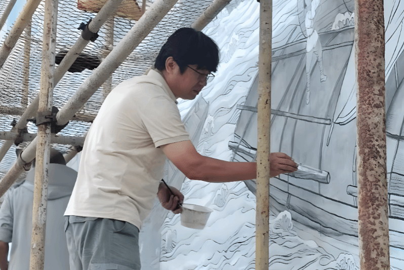 近年来,关明新受邀参与了三垟大道下穿S1线艺术创作工程、山福镇驿头驿阳村景观设计工程和陶山洲渎村艺术涂鸦工程这三项城市公共艺术景观的创作。在山福镇驿头驿阳村景观创作中,关明新结合北宋王希孟《千里江山图》的青绿配色,提炼温州“千年商港”文化基因为创作灵感,以八百里瓯江为时间轴来整体设计画面,将千年古驿的历史故事与驿头人民勇闯世界的“四千精神”通过画笔娓娓道来,展现着“海丝之路 瓯江云涌”的宏大场景。如今,这幅壁画也已成为往来游客到访驿头驿阳村的必游“打卡点”。