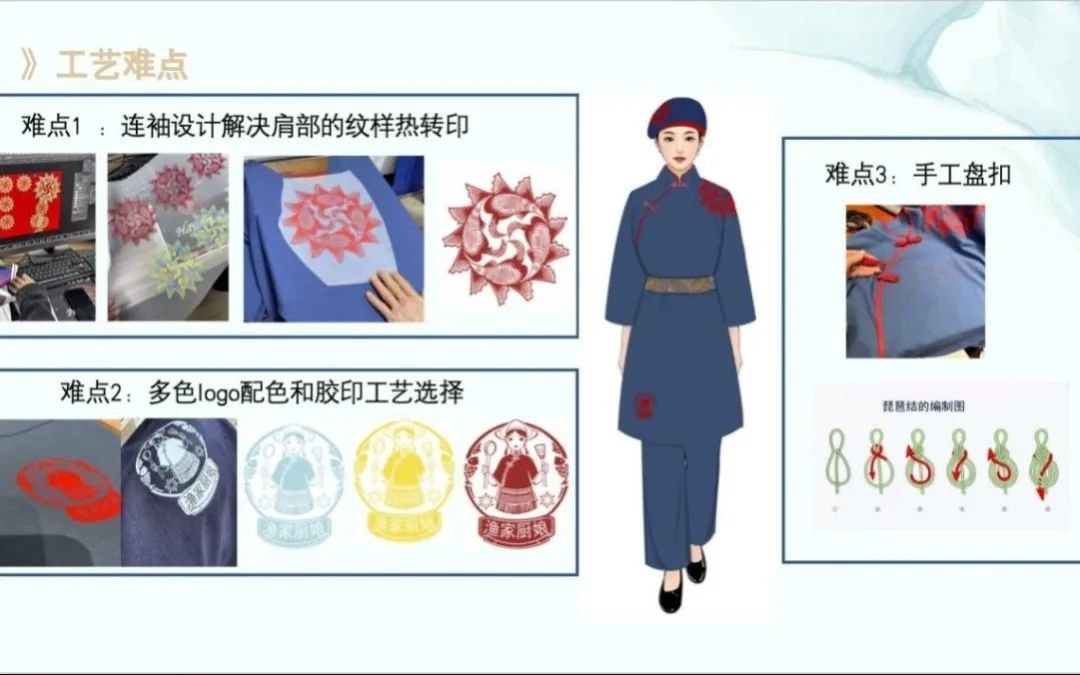 在设计过程中,团队遭遇并成功攻克了诸多技术难关。为确保肩部图案的完整性,创新采用中式连袖设计;为实现logo元素与不同面料色彩的完美适配,团队不辞辛劳,多次奔赴厂家反复调整稿件;每一件服装还精心搭配手工盘扣,为整体设计增添了一抹浓郁的传统韵味。从电脑纹样设计、面料采购,到样板制作、裁剪、缝纫、印花制作、手作盘扣,再到制作头巾,整个流程历时长达三个月,才终于打造出满意的样衣。