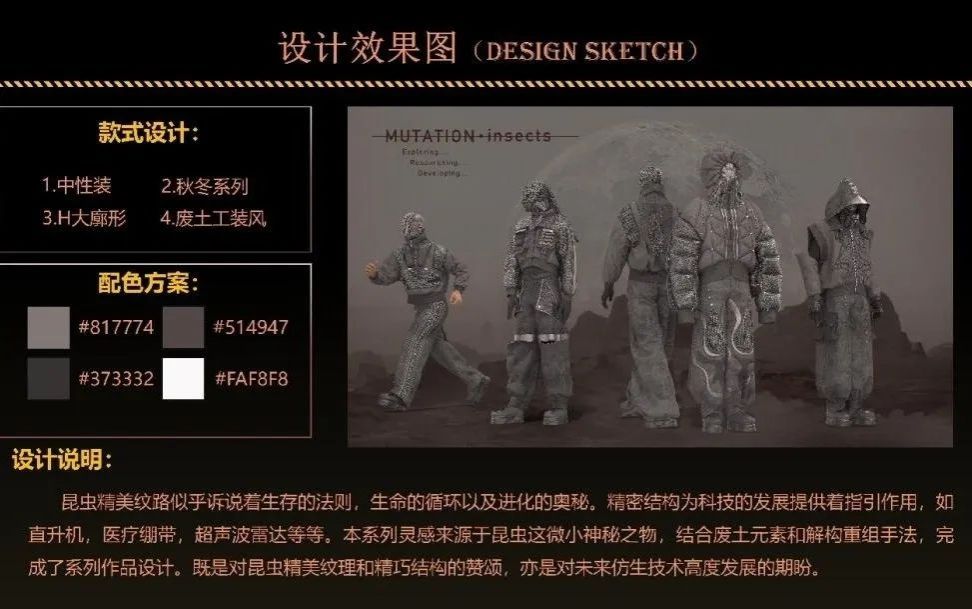 在指导学生参加服装服饰创意设计大赛时,她引导学生借助数字化手段,打造出美轮美奂的虚拟走秀场景。范逸阳同学的作品《MUTATION.insects》便是其中的典型范例,充分展现了科技与设计融合的无限可能。