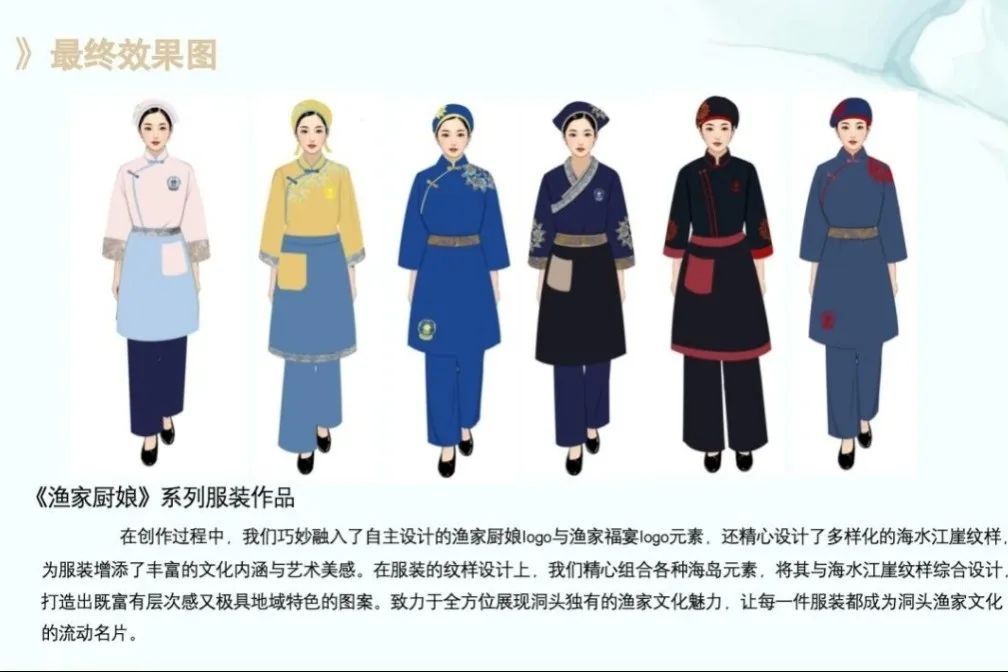 设计中,原创的渔家厨娘logo与渔家福宴logo元素被巧妙融入,海水江崖纹样也经过精心构思,焕发出新的活力。服装款式上,中式斜襟衫搭配直筒裤,再辅以防水围裙与渔家头巾发箍,既充分考量了渔家劳作的实际需求,又淋漓尽致地展现出闽瓯传统服饰的独特韵味。纹样设计更是将渔家福宴logo元素与海水江崖纹样有机融合,层次丰富、错落有致,地域特色鲜明夺目,全方位、多角度展现出闽瓯文化与渔家文化碰撞交融的独特魅力。