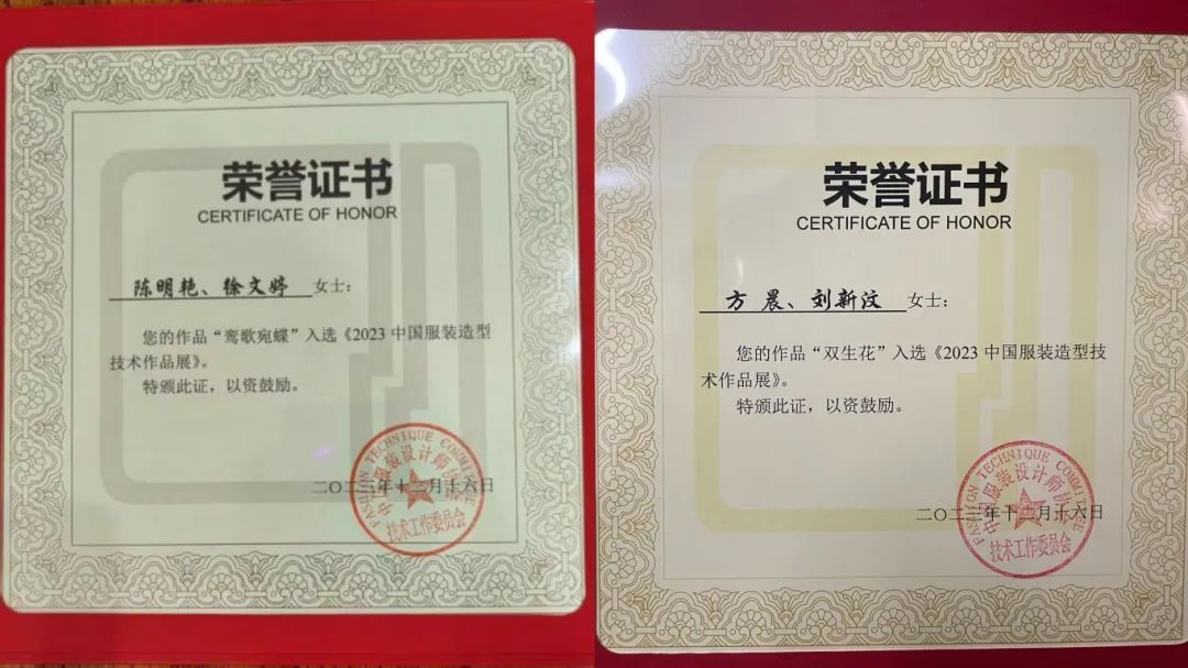 入选中国服装造型技术作品展的作品与证书