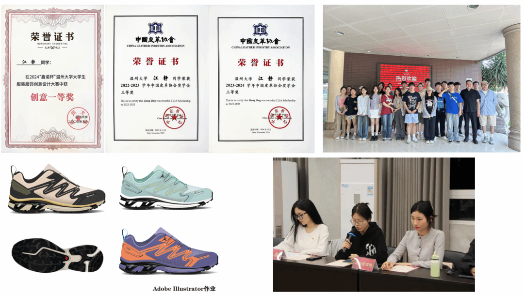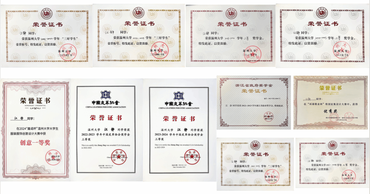 在学术探索的征程中,江静始终以卓越的进取精神和扎实的专业素养,成为同学们眼中的学习楷模。课堂之上,她全神贯注、踊跃发言,积极与教师互动,为课堂注入活力;课后,她常驻图书馆,查阅大量资料、钻研复杂课题,不断拓展专业知识的深度与广度。凭借扎实的专业基础和创新思维,她在专业学习中屡创佳绩,她积极参与学术科研项目,并在各类学术竞赛中斩获诸多荣誉,如连续两年获得中国皮革奖学金三等奖、“鑫诺杯”设计大赛一等奖以及中国(深圳)鞋包设计大赛B革优秀奖等。此外,她还积极参与暑期学习小组,与Skechers设计师深度对接,完成其提出的设计任务。在一个月的实践学习中,她成功设计了四款鞋面和两款侧墙设计,进一步锤炼了自己的专业能力。