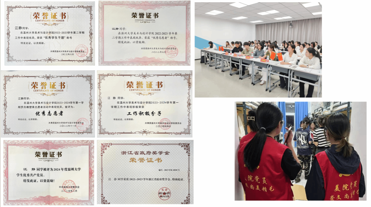 担任班级学习委员期间,江静积极协调班委与同学,通过组织研学、课程展等活动,扎实推进班级建设工作。在她的带领下,21服设4班以扎实的学风和团结奋进的风貌,连续两年荣获“最强学习团支部”称号。在完成学业的同时,她多次主动参与各类志愿服务活动,以实际行动诠释了党员的责任与担当,生动展现了新时代青年党员的风采,为广大同学树立了良好的榜样。
