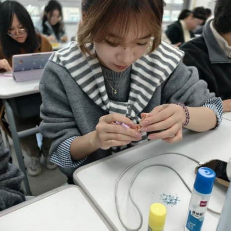 指尖翻飞间,原本零散的贝壳片,经同学们的巧思与巧手,渐渐变成了一件件精致灵动的螺钿作品。打磨、粘贴、调整,每一个步骤都饱含心意;勾勒、搭配、点缀,每一处细节都彰显匠心。创作完成后,同学们在心意卡片上写下真挚的祝福,将螺钿作品精心包装,亲手赠予身边的同学,一句句暖心的话语、一件件精美的作品,传递着同窗间的真诚与善意,现场氛围温馨而热烈。